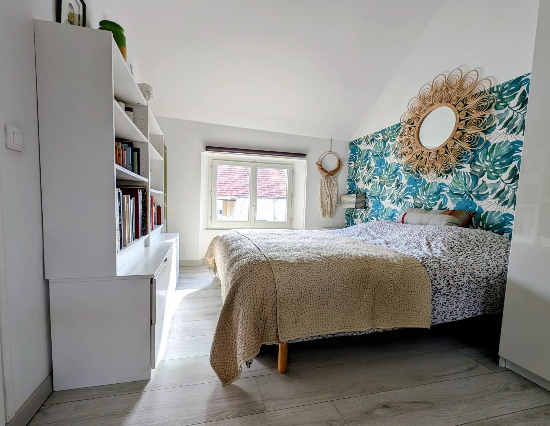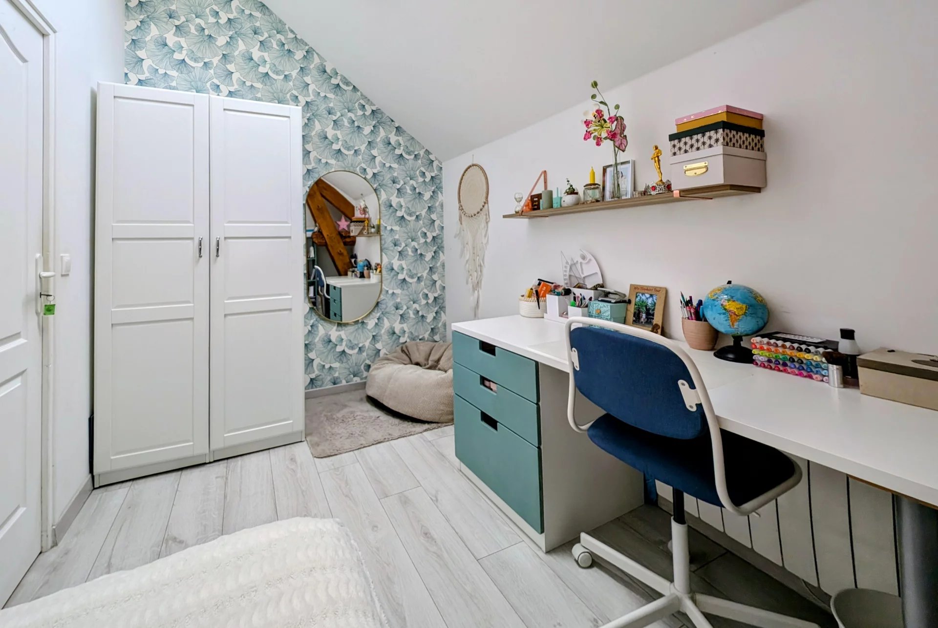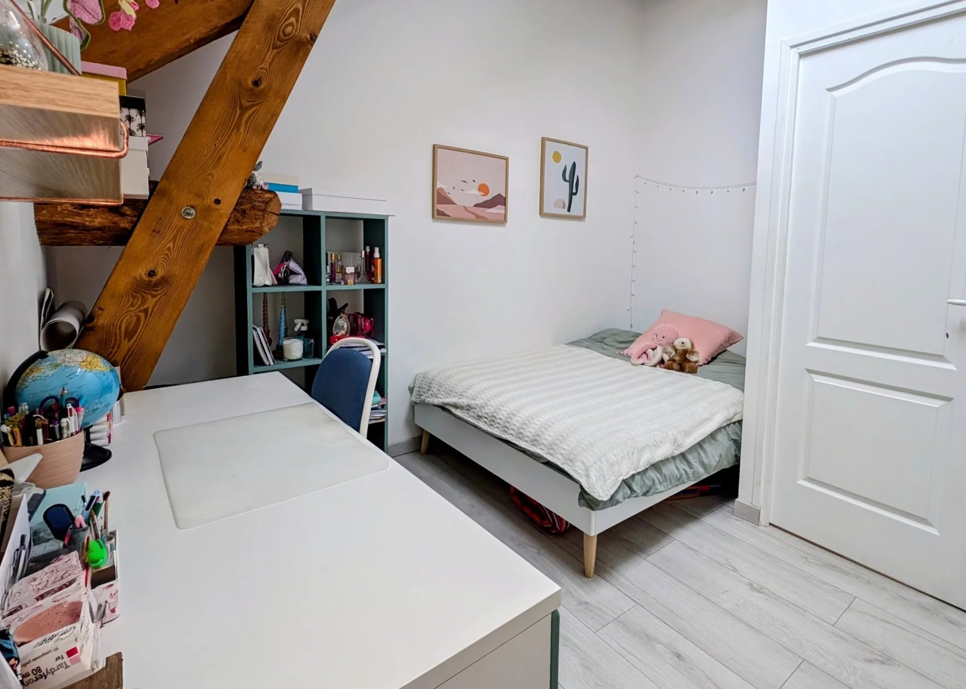 À l'étage, c'est un palier qui dessert deux chambres et une salle de douche avec toilettes ainsi qu'un espace pour la buanderie. L'une des chambres, spacieuse peut être aménagée en partie en bureau ou en dressing.