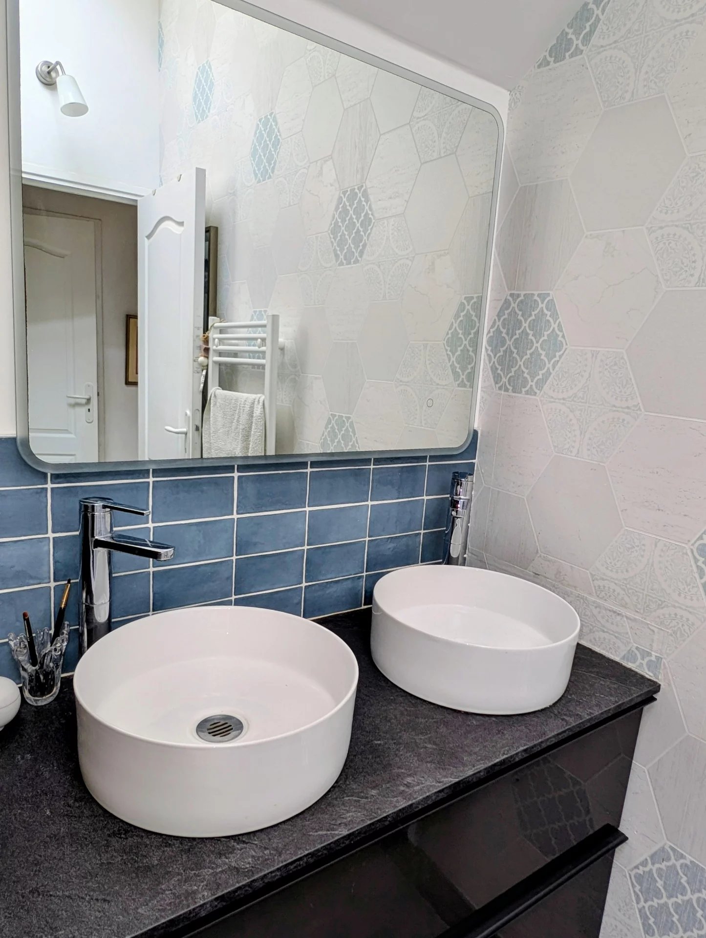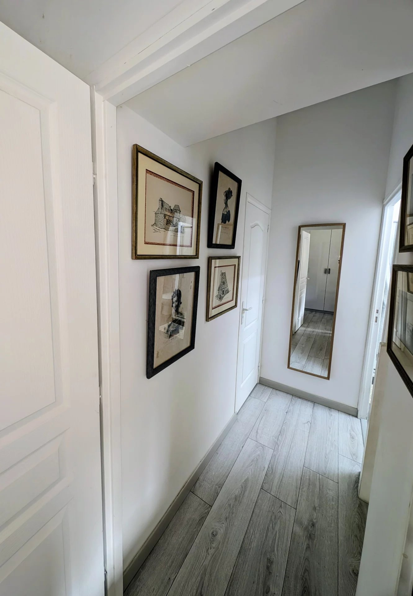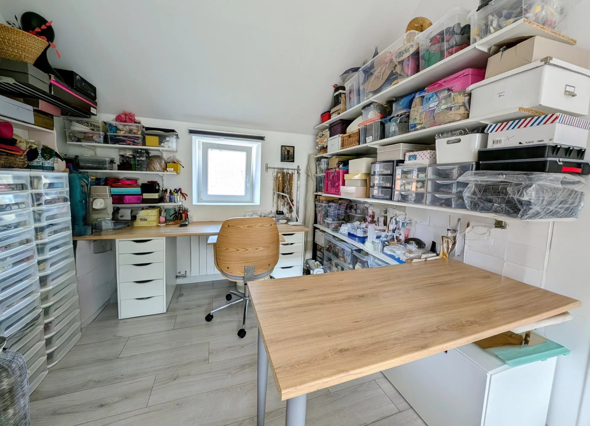 À l'étage, c'est un palier qui dessert deux chambres et une salle de douche avec toilettes ainsi qu'un espace pour la buanderie. L'une des chambres, spacieuse peut être aménagée en partie en bureau ou en dressing.