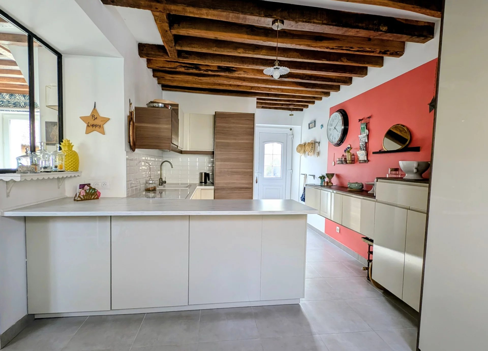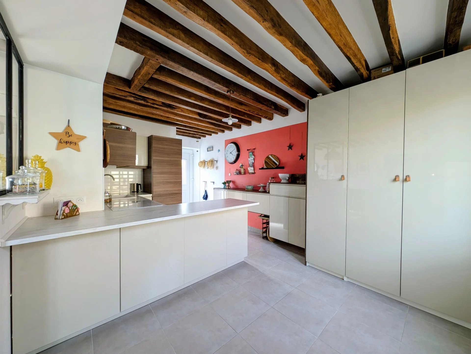 Venez découvrir cette maison aménagée avec en rez de chaussée avec une entrée, une cuisine entièrement équipée, ouverte en partie sur le séjour et sa salle à manger, formant un espace à vivre de 35 m². Des sanitaires et des placards complètent ce premier niveau.